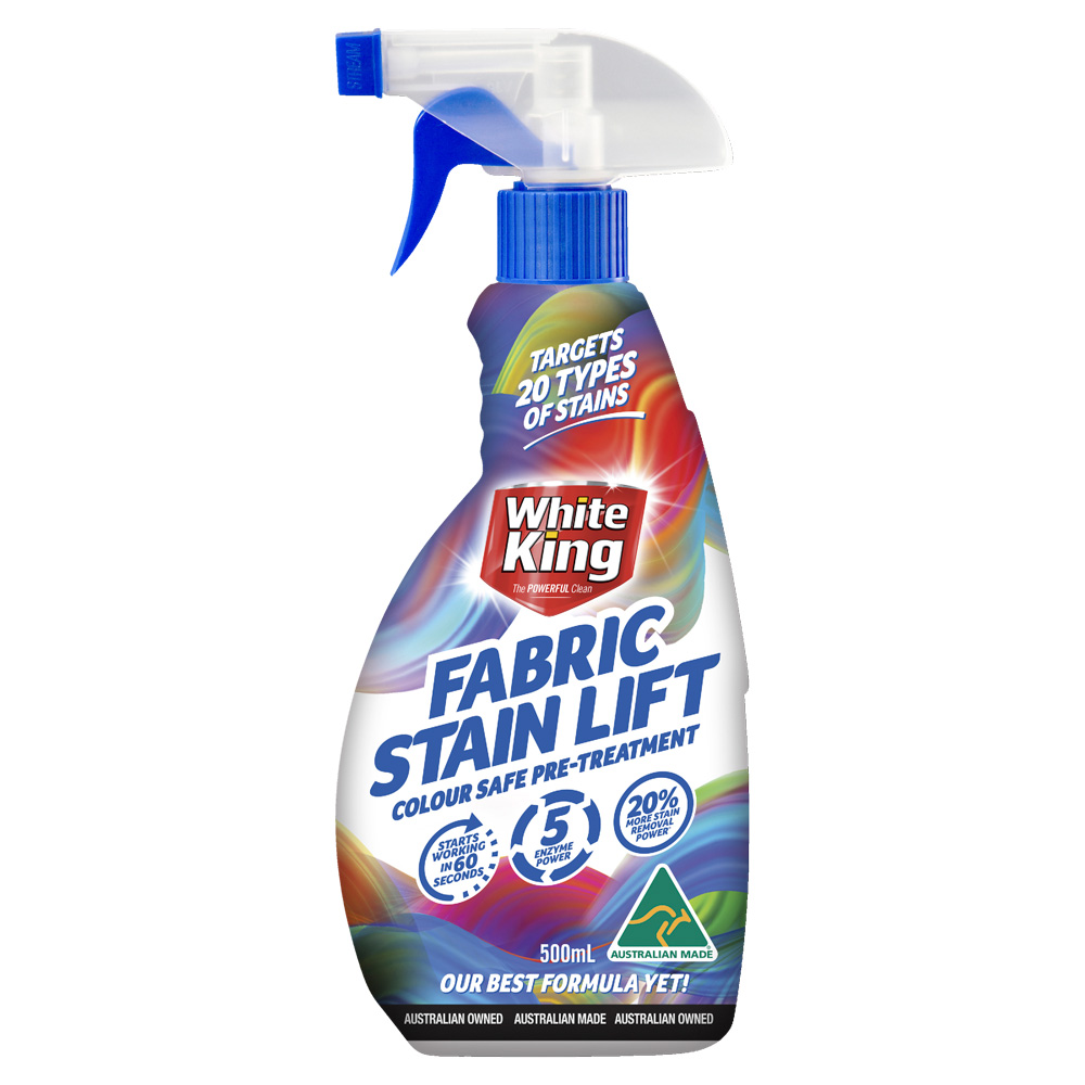 White King Oxy-Lift Fabric Stain Remover for laundry uses the power of oxygen and enzymes to remove tough stains and brighten colours and whites. It is also biodegradable and antibacterial and uses a triple enzyme action to target stains.